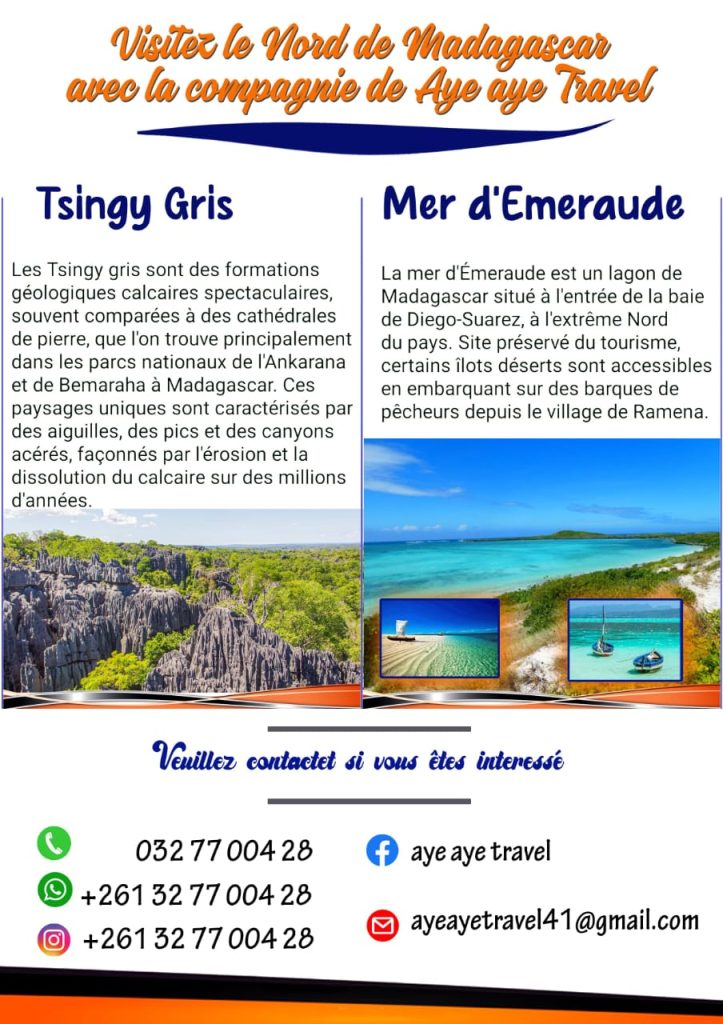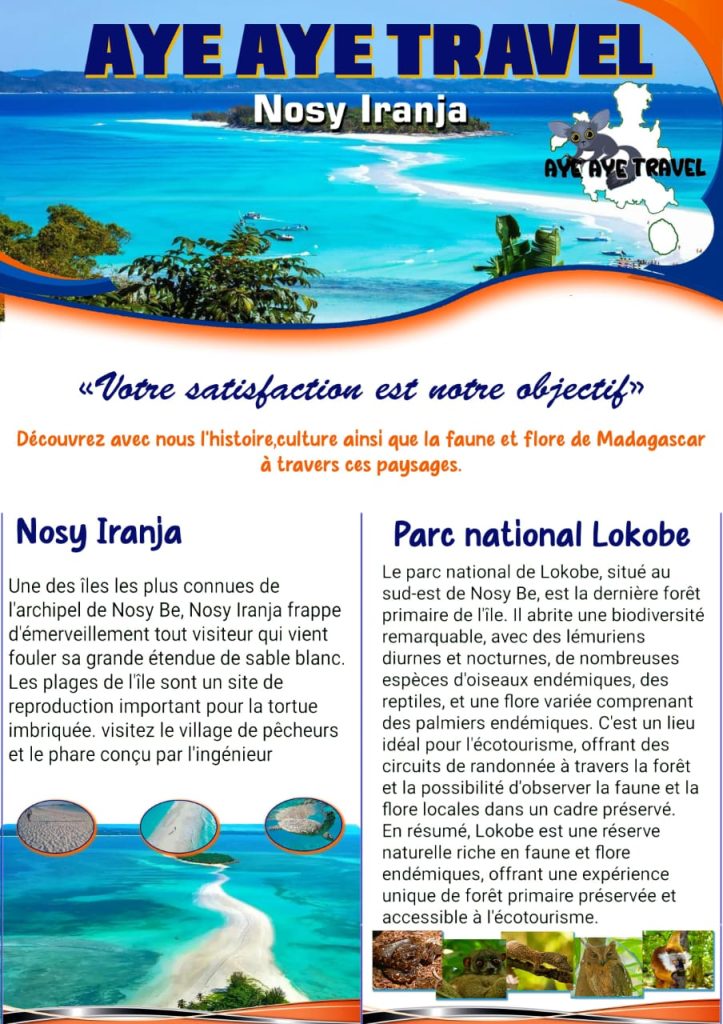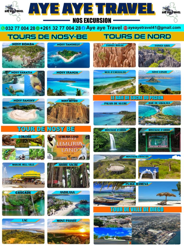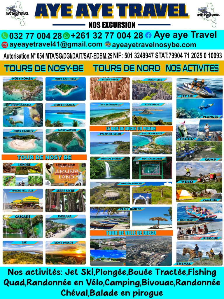 Avec Aye Aye Travel, chaque sortie est une aventure authentique, accompagnée par des guides passionnés qui connaissent l’île et ses secrets. Que vous soyez amoureux de la mer, passionné de nature ou en quête de détente, Nosy Be vous réserve une expérience inoubliable.